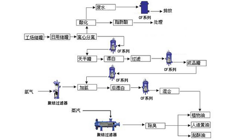 油進(jìn)入天平罐進(jìn)行稱重和儲藏。從天平罐出來后進(jìn)行漂白祛除顏色。脫色的油通過過濾祛除漂白的黏液,并進(jìn)入清潔油成品罐。成品罐中出來的油進(jìn)行加氫出來,使
