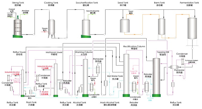 (4) 發(fā)酵:在發(fā)酵階段,糖化液被酵母發(fā)酵,然后將產(chǎn)生酒精。過程包含酵母繁殖,酒精發(fā)酵,等等。之后,發(fā)酵白酒類可通過熱交換器冷卻,然后送到蒸餾階段。